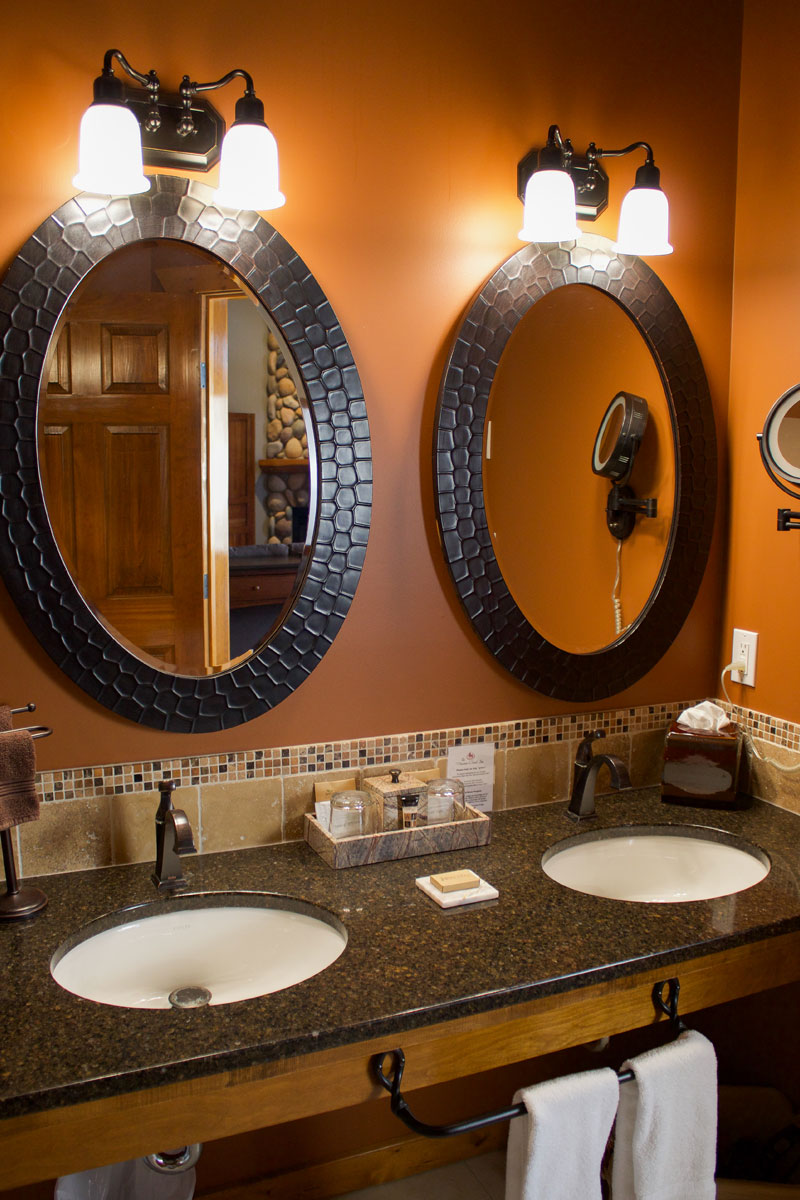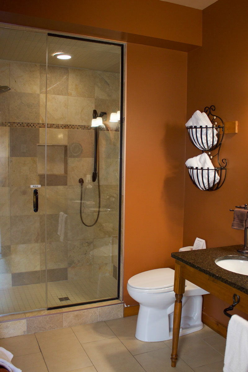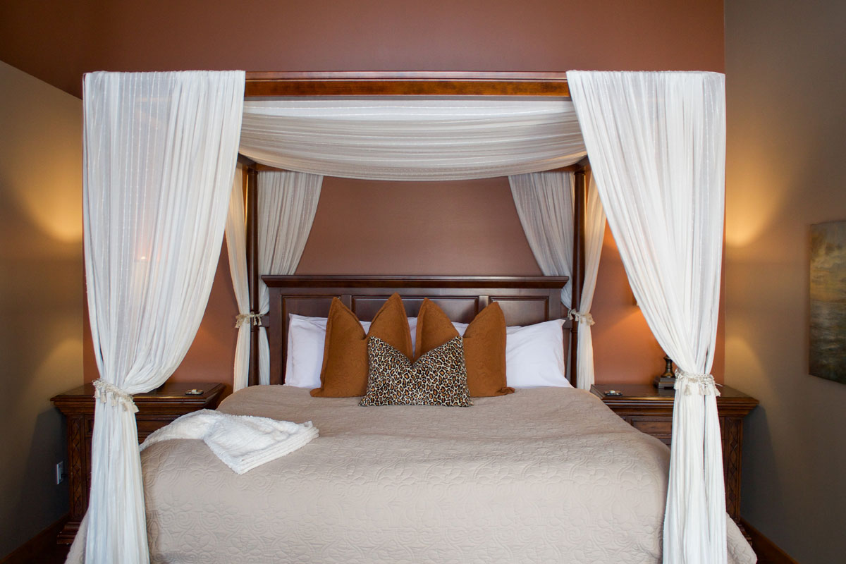 For an ultimate romantic getaway, this outstanding luxury suite is our largest room with a king size four poster bed, in-room double Whirlpool tub, steam shower, double vanity with vessel sinks, towering gas fireplace, vaulted ceilings and a large private balcony with a view of the grounds.